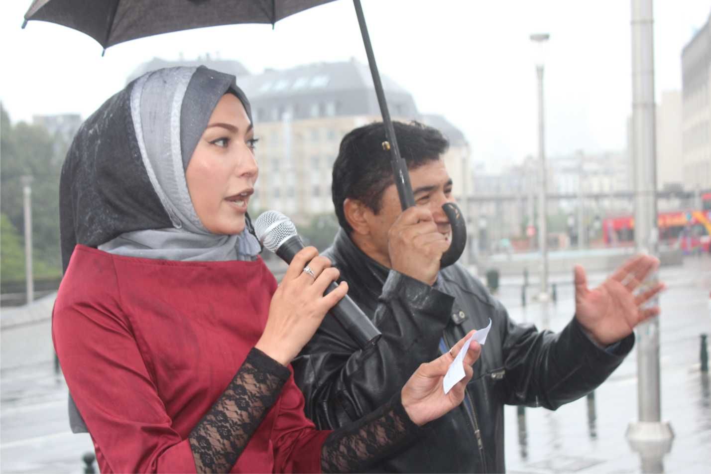 Belçikalıların büyük ilgi gösterdiği protesto mitinginde İngilizce ve Fransızca bildiriler dağıtılarak, Çin’in Türkistan’daki Uygur Türklerine yönelik baskı ve katliamları anlatıldı.