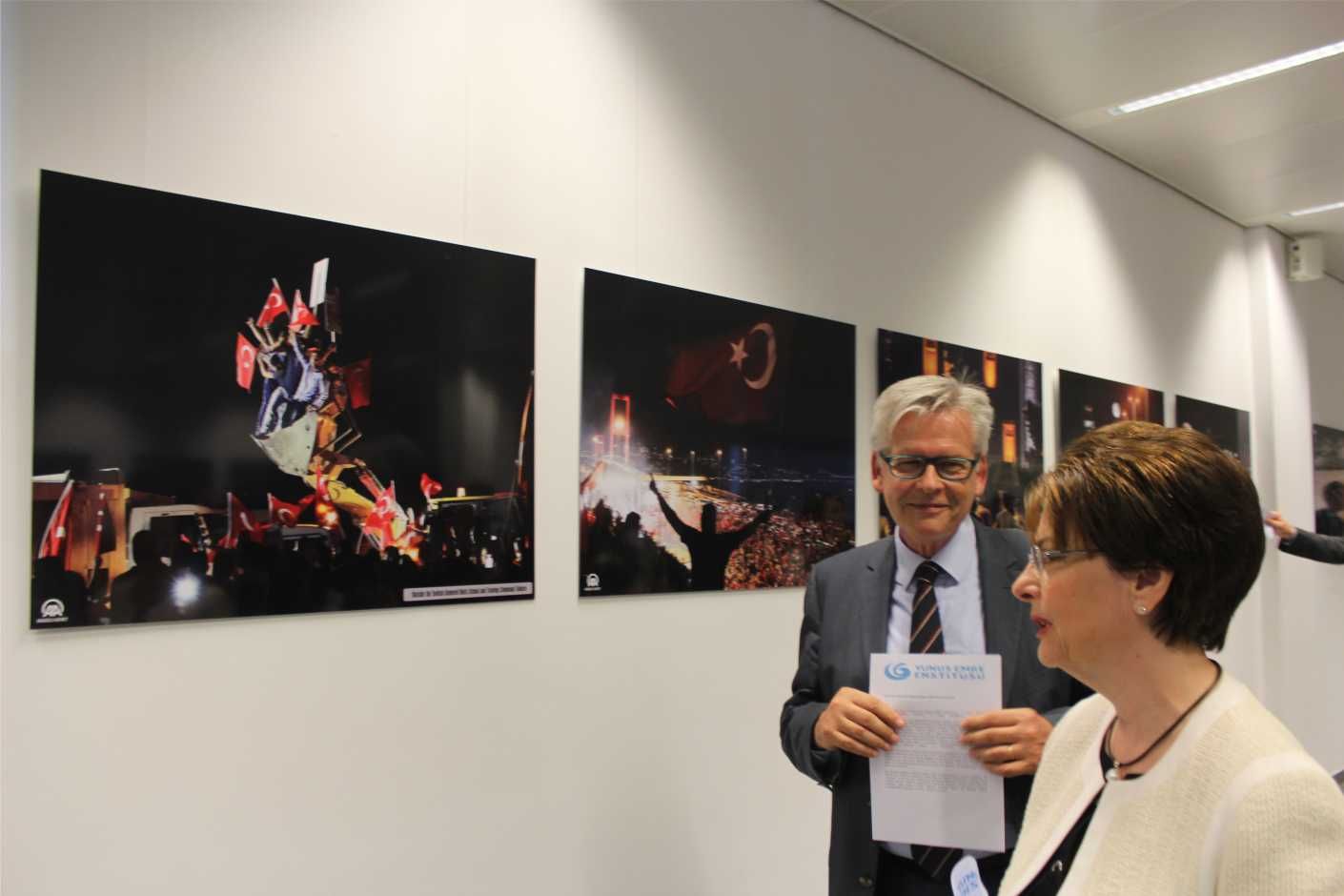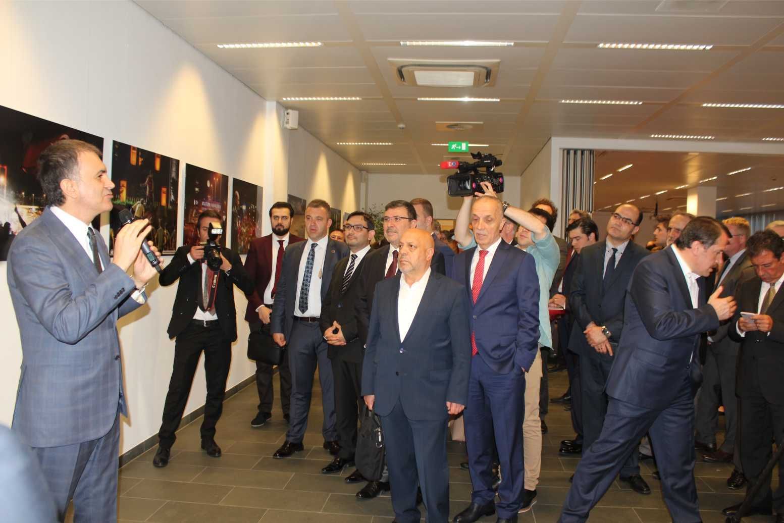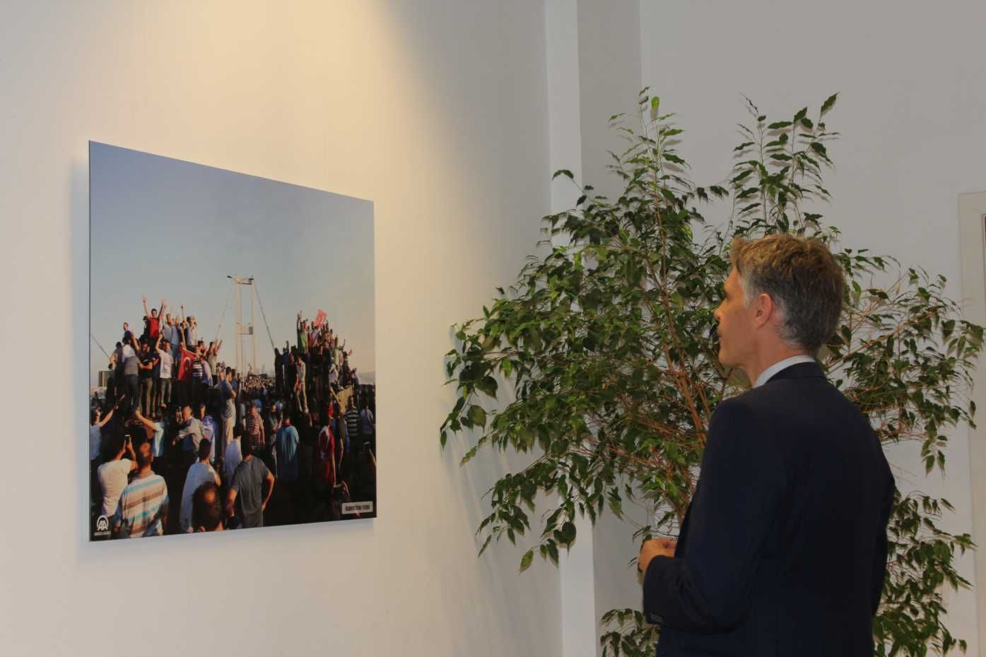 Türkiye’nin Brüksel Büyükelçisi Mehmet Hakan Olcay, “Bu sergi geçen sene demokrasimizi hedef alan darbe girişimini anlamaya yardımcı oluyor. Milletimizin darbecilere karşı nasıl dimdik ayakta durduğunu ve demokrasinin galip geldiğini orta koyuyor.” diye konuştu.