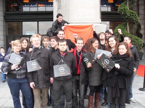 Küresel krizden sonra işsizlik sorunun çığ gibi büyüdüğu Belçika´da bu fabrika da kapadığı takdirde, işsizler kervanına yaklaşık bir beş bin civarında insan daha eklenecek. Kapatılma kararının basına açıklanmasından sonra karara tepkisiz kalmayan Anvers ´Opel´ fabrikası işcileri, ilk günden bu yana fabrikları önünde grev yapıyorlar. Onlara destek olmak için, Sp.a (Flaman Sosyalist Parti) Gençlik Kolları ´Büksel otomobil fuarı´nın sergilendiği tarihi binanın önünde, ´Opel´ işçileri için eylem düzenlediler. Burada toplanan Sp.a´lı gençler, eylemleri sırasında tepkilerini şu slogan ile dile getirdiler, ´Wir leben auto´s, wir töten arbeit´, yani ´arabalari yaşattırıyoruz, işi öldürüyoruz´.