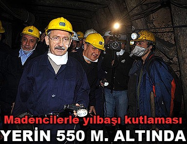 CHP Genel Başkanı Kemal Kılıçdaroğlu, Manisa'nın Soma ilçesinde Darkale maden ocağında, yerin 550 metre altına inerek maden işçileriyle yeni yılı kutladı.