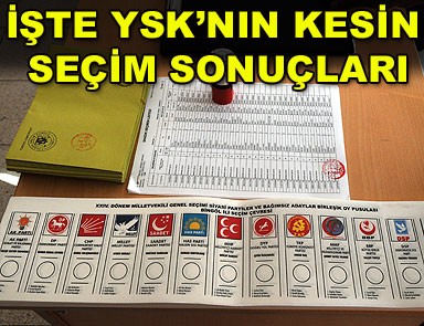Yüksek Seçim Kurulu, 24. dönem milletvekili seçimleri kesin sonuçlarını açıkladı. Resmi Gazete'de yayımlanan kesin seçim sonuçlarına göre, 12 Haziran'da yapılan seçimlerde 43 milyon 914 bin 948 seçmen oy kullandı. 973 bin 185 oy geçersiz sayıldı.