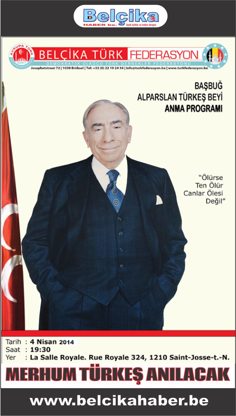 Kısa adı BTF olan Belçika Türk Federasyonu tarafından gönderilen duyuru haberi sizlerle paylaşıyoruz. Merhum Başbuğ Alparslan TÜRKEŞ Bey'i Vefatının 17. Seney-i Devriyesinde Rahmetle ve Minnetle Anıyor...