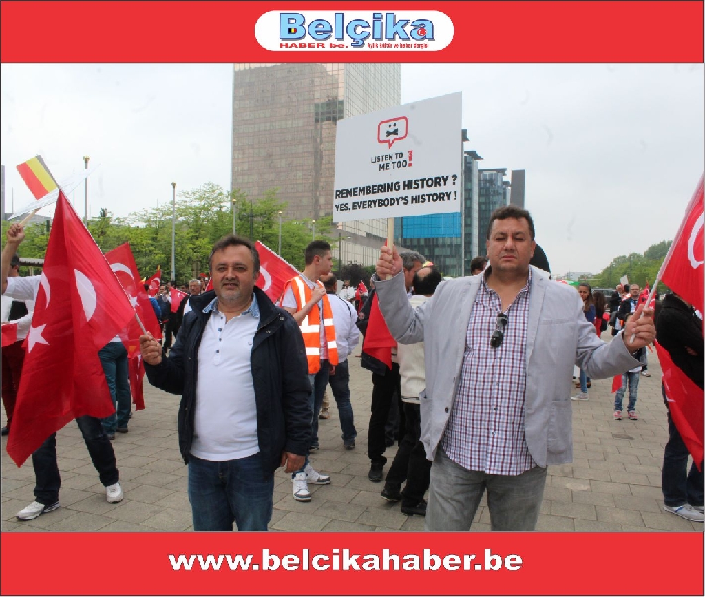 Sözde Ermeni soykırımı iddialarına karşı ortak bir tavır sergilemek amacıyla ellerinde Belçika ve Türk bayrakları ile Miting alanını dolduran Belçikalı Türkler, « Son zamanlarda Belçika Parlamentolarında 1915 olaylarına ilişkin yasa ve karar tasarılarının hazırlanması, Arami ve Süryani sözde “soykırımlarına” ilişkin anıtların belediyelerce meydanlara dikilmesi ve bütün bu gelişmeler yaşanırken, Belçika Türk toplumunun muhatap alınmaması, Türk toplumuna söz hakkı tanınmaması, hatta susturulmak istenmelerini beyaz giysiler içerisinde ağızlarına siyah bant yapıştırıp, ‘Beni de Dinle’ diyerek 7 kıtayı temsilen beyaz güvercin uçurdular, gökyüzüne beyaz balonlar uçurarak protesto ettiler.