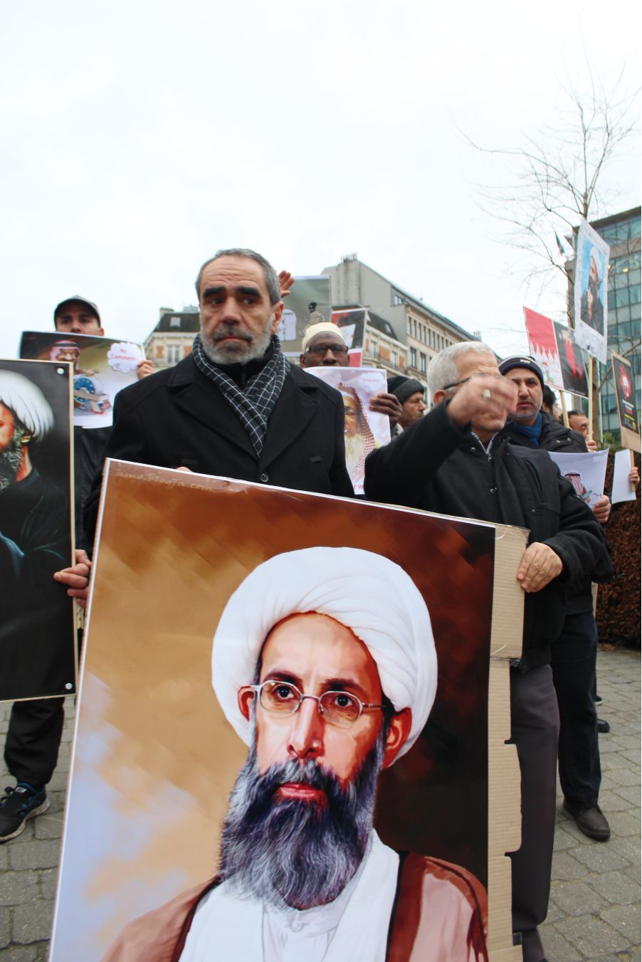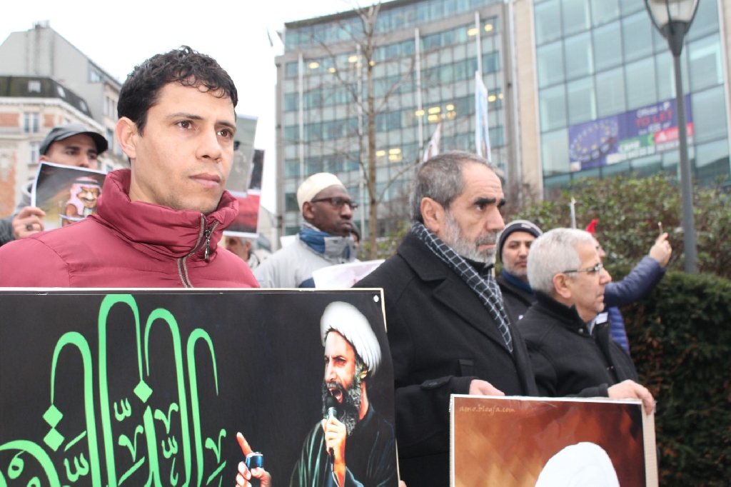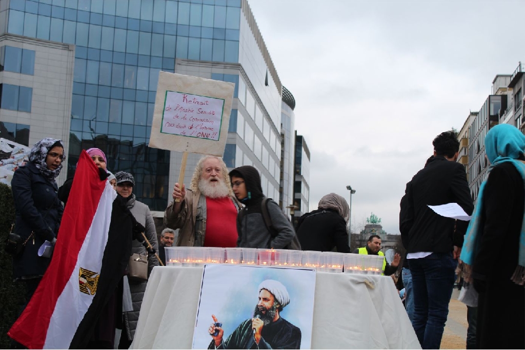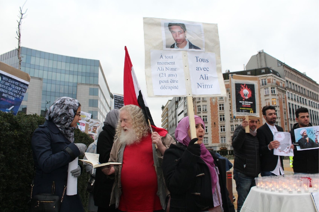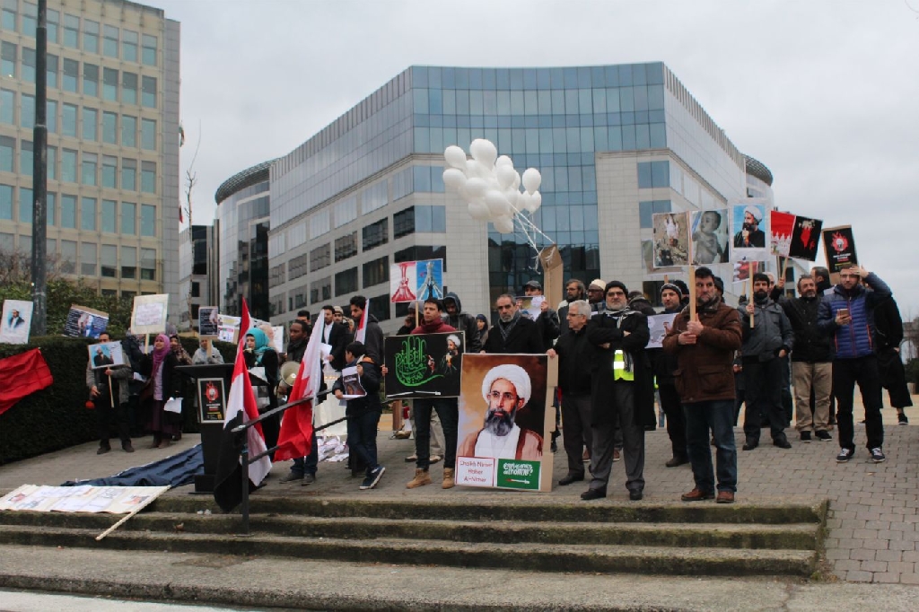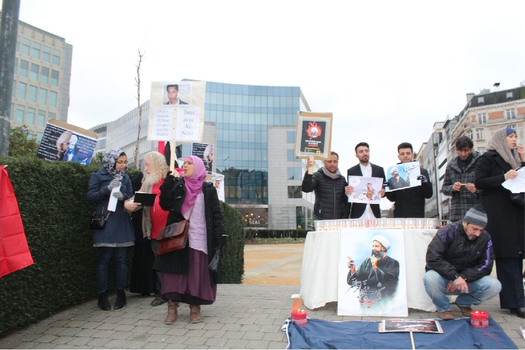 AB Binalarının bulunduğu meşhur Shuman meydanında bir araya gelen İran, Irak, Suriye, Lübnan, Pakistan, Azerbaycan, Endenozya, Afganistan, Nijerya, Bahreyn, Yemen, Türkiye ve Filistinli onlarca kişi ellerinde Ayetullah Nemr, Enserullah Lideri Abdulmelik el Husi ve Nijerya Şii Lideri İbrahim Zakzaki’nin resimlerini taşıdılar.