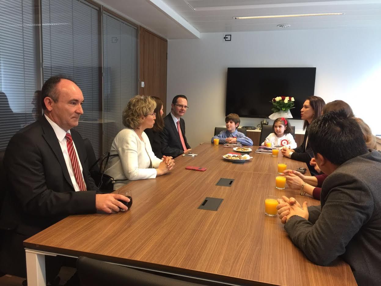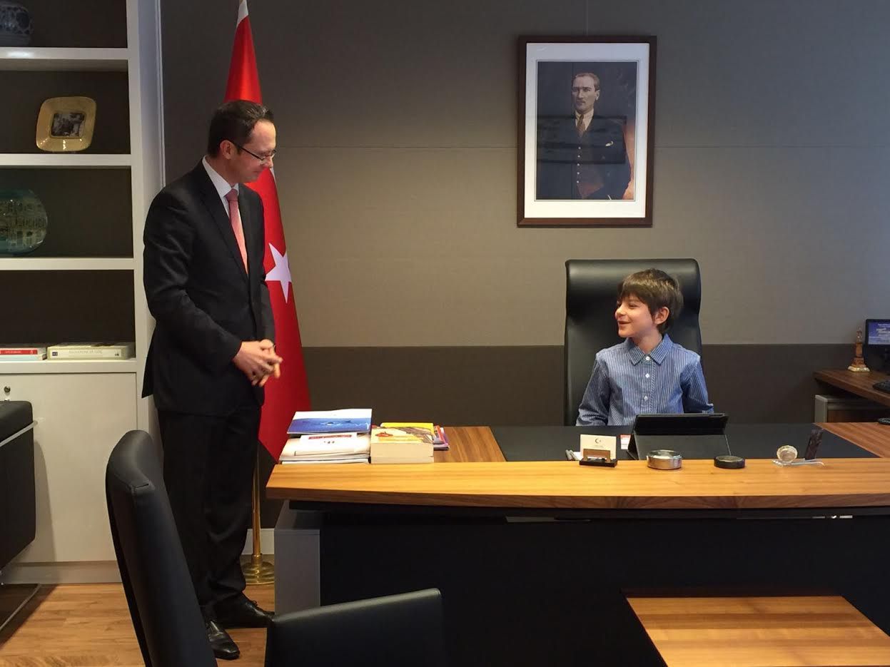 Türk Dili ve Kültürü öğretmenlerinden Zeynep Uludüz'ün eşlik ettiği İlkolkul 1. sınıf öğrencisi Eylül Öz ile 2. sınıf öğrencisi Teoman Hilhorst, Başkonsolos Ulusoy'un koltuğunu bir süre devraldı.