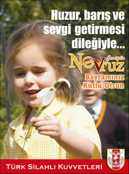 Genelkurmay, internet sitesinde tüm vatandaşların Nevruz Bayramını kutladı. Genelkurmay, internet sitesinde yayınladığı, elinde çiçek tutan küçük bir kız çocuğunun fotoğrafı ile tüm vatandaşların Nevruz Bayramını kutladı. Genelkurmay Başkanlığı'nın internet sitesinde yayınlanan fotoğrafın üzerinde, "Huzur, barış ve sevgi getirmesi dileğiyle... Nevruz Yenigün Bayramınız kutlu olsun. Türk Silahlı Kuvvetleri" mesajı yer alıyor.
