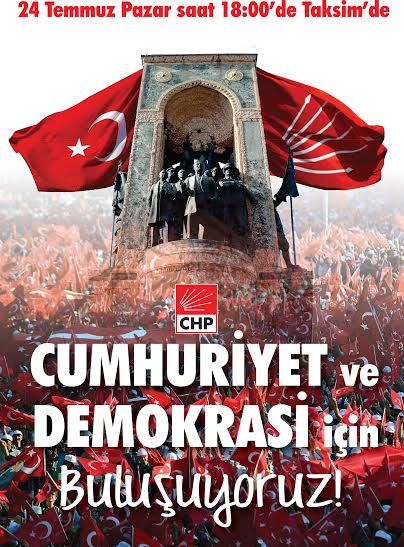- "24 TEMMUZ PAZAR GÜNÜ, İSTANBUL TAKSİM’DE CUMHURİYET VE DEMOKRASİ MİTİNGİ DÜZENLEME KARARI ALARAK, RESMİ BAŞVURUMUZU BUGÜN GERÇEKLEŞTİRDİK"