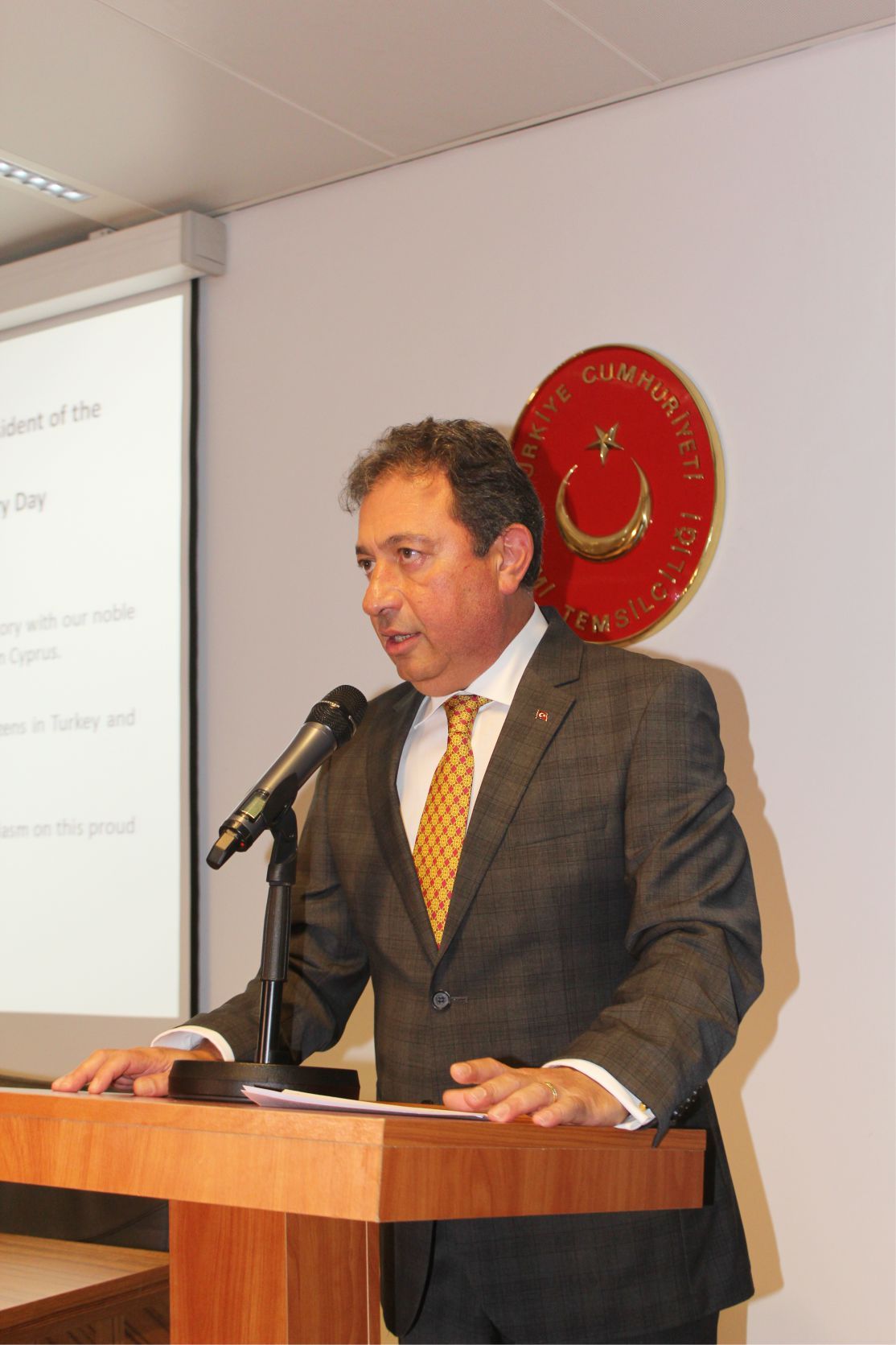 TC Brüksel Büyükelçisi Mehmet Hakan Olcay bu vesileyle konuklara İngilizce ve Türkçe olarak yaptığı hitabında büyük zaferin 95. yıldönümü kutlayarak, akabinde Cumhurbaşkanı Recep Tayyip Erdoğan’ın 30 Ağustos mesajını Türkçe sözlü İngilizce sinevizyon gösterimiyle paylaştı.