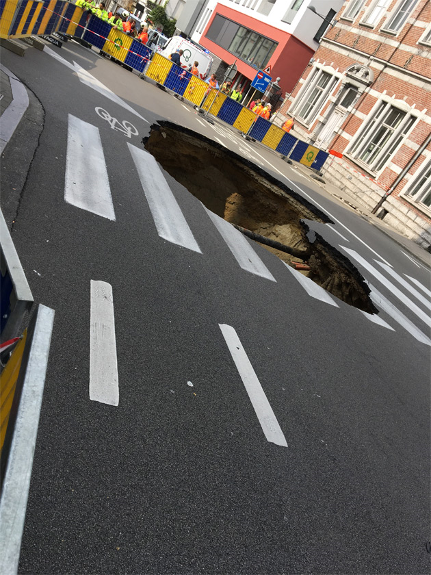 Dün sabah Chaussée de Louvain'de yolda büyük bir göçük meydana geldi. Chaussée de Louvain, n: 205 civarında toprak altında bir su patlaması sonucu biriken su önce burada, daha sonra da biraz ileride yolun ortasında büyük bir göçüğe yol açarak yakındaki tren yolunna aktı. Sabah önce sular kesildi.