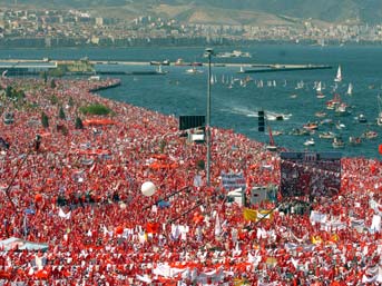 Ãeşitli sivil toplum örgütlerinin girişimleriyle düzenlenen Gündoğdu Meydanı'ndaki Cumhuriyet mitingine katılmak isteyenler, saat 07.30'dan itibaren ellerinde Türk bayraklarıyla alanda toplanmaya başladı. Bin 800 polisin görev yaptığı alana katılımcılar tek tek üst araması yapılarak alınıyor. Miting alanında geniş güvenlik önlemleri uygulanırken, Birinci Kordon dün geceden itibaren trafiğe kapatıldı, İkinci Kordon'da da park yasağı uygulanıyor. Türk bayraklarıyla donatılmış şehir hatları vapurları, sahil boyunca tur atarken, bazı belediyeler mitinge katılanlara bayrak, şapka ve Atatürk posterleri dağıtıyor. Cumhuriyet ve Gündoğdu meydanlarına belediye tarafından seyyar tuvaletler kuruldu. Alan çevresinde Türk bayrağı ve su satan çok sayıda seyyar satıcı olduğu görüldü. Alsancak Limanı bölgesinden de alana girişler yapılıyor. Ãzerlerinde ''Balçova Belediyesi'' yazılı tişörtler giyen bir grup, küçük bir tiyatro gösterisi sundu. Ellerinde ''Edison pişman'' yazılı pankartlar taşıyan grup, hükümet aleyhine çeşitli sloganlar attı. Antalya'dan gelen bir grubun getirdiği yaklaşık 1 kilometre uzunluğunda Türk bayrağı, İzmir Limanı girişinden Gündoğdu Meydanı'na kadar olan yolda, grup tarafından ellerde taşınarak sokuldu. Katılımcılar bayrağa sevgi gösterilerinde bulundu. İzmir dışından mitinge katılmak isteyenlerin sabahın erken saatlerinden itibaren otobüslerle kente geldikleri gözlendi. Mitingin başlamasına 2 saatten fazla zaman olmasına rağmen, Gündoğdu Meydanı doldu. Düzenleme komitesi katılımcıları, ''Anadolu'nun işgalinde ilk kurşunu atan kente hoş geldiniz'' diyerek karşıladı.