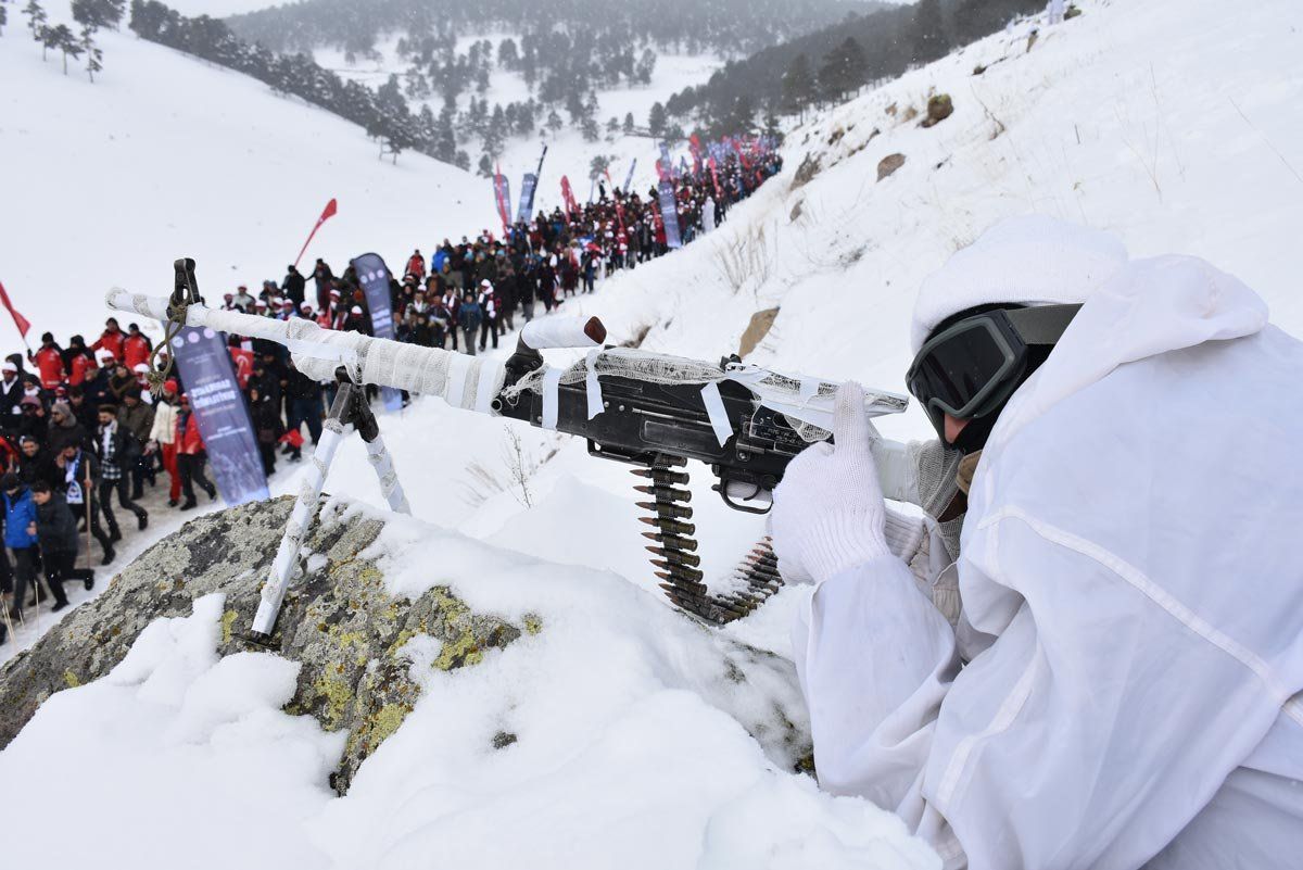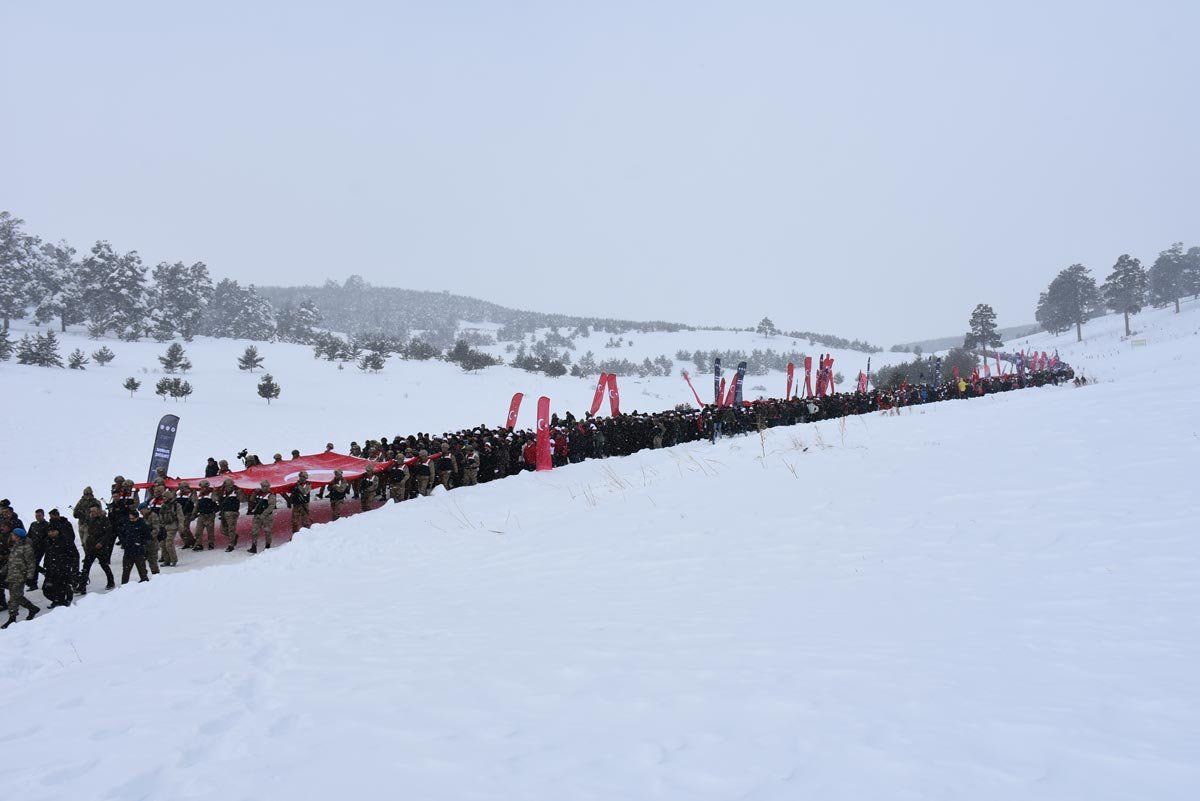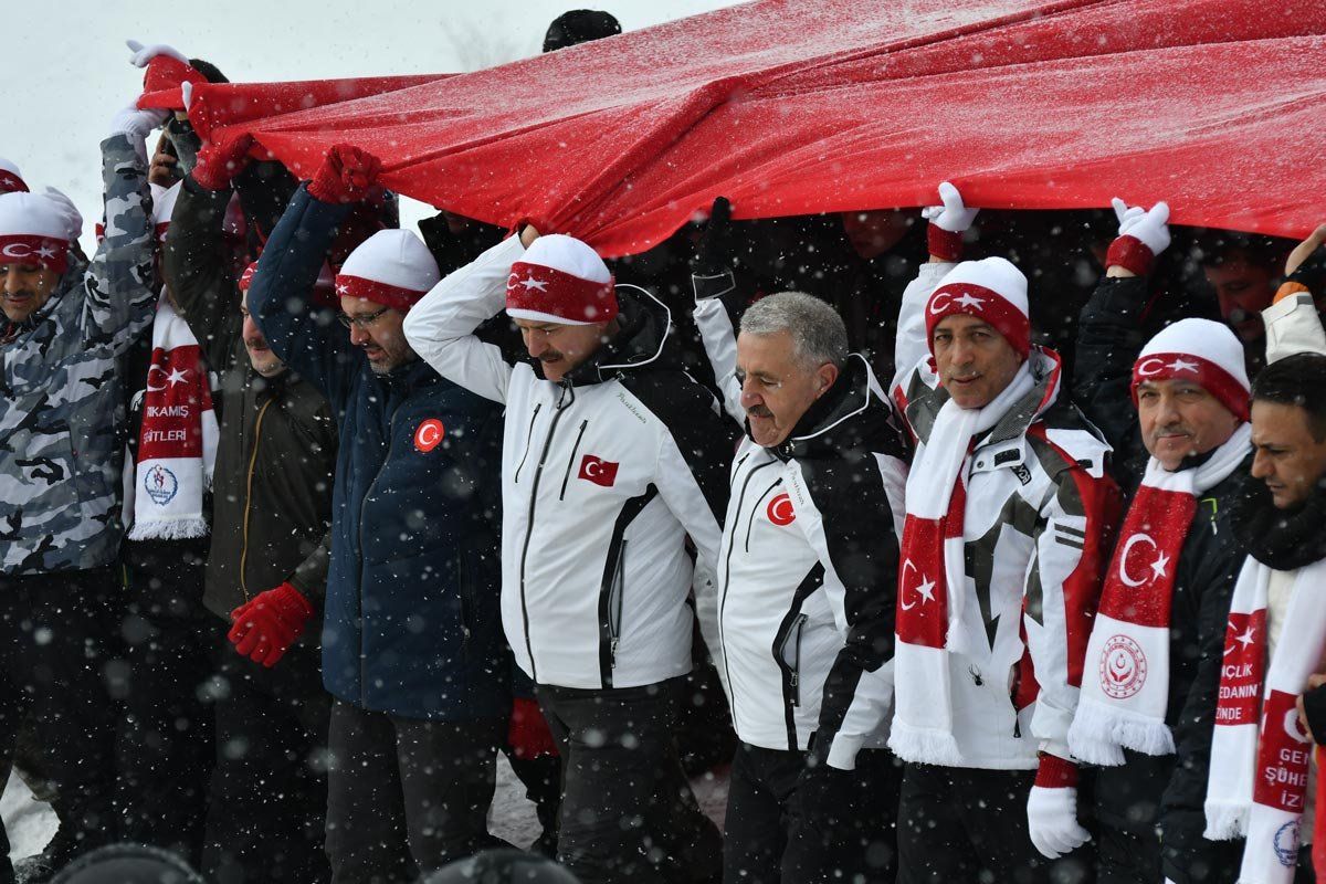 Katılımcılar, dev bayrak ve Atatürk posterleri taşıyarak, 'Şehitler ölmez vatan bölünmez' sloganlarıyla kar yağışı altında yürüyüşe başladı. Zorlu yürüyüşe katılanlar, 6,5 kilometrelik 'Şehit Kurmay Albay Faruk Sungur Yolu'nu izleyerek, Yukarı Sarıkamış Mahallesi'ndeki tören alanında yürüyüşü sonlandıracak.