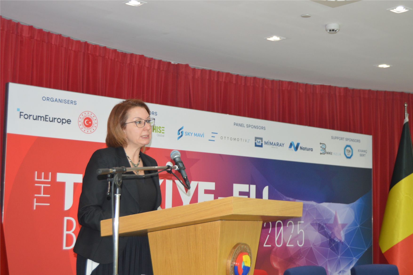Dönmez, "Türkiye'nin yeşil, dijital dönüşüm, teknoloji, ticaret gibi tüm alanlarda AB ile iş birliğini derinleştirmeye hazır olduğunu vurgulamak isterim. Güçlerimizi birleştirerek, bu parçalanmış dünyada daha güçlü, daha sürdürülebilir ve daha yenilikçi bir Avrupa inşa edebiliriz. Küresel ölçekte daha rekabetçi bir AB'nin güçlü, modern ve tam entegre bir Türkiye'ye ihtiyacı var." ifadelerini kullandı.
