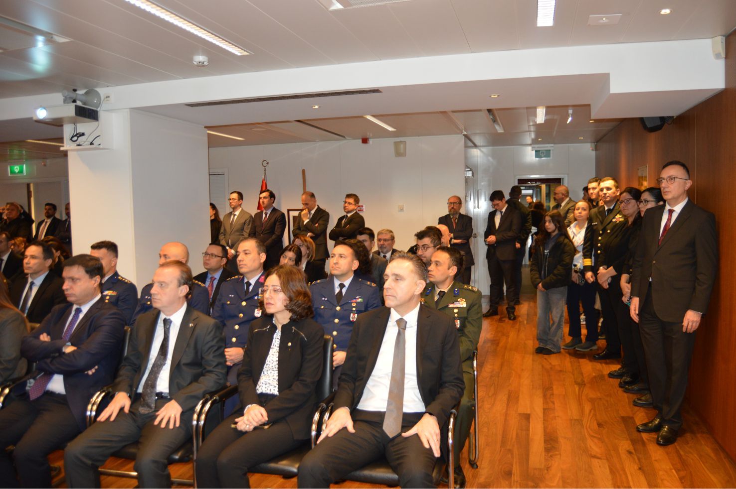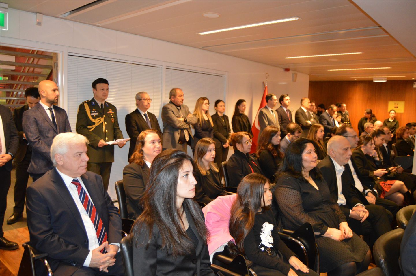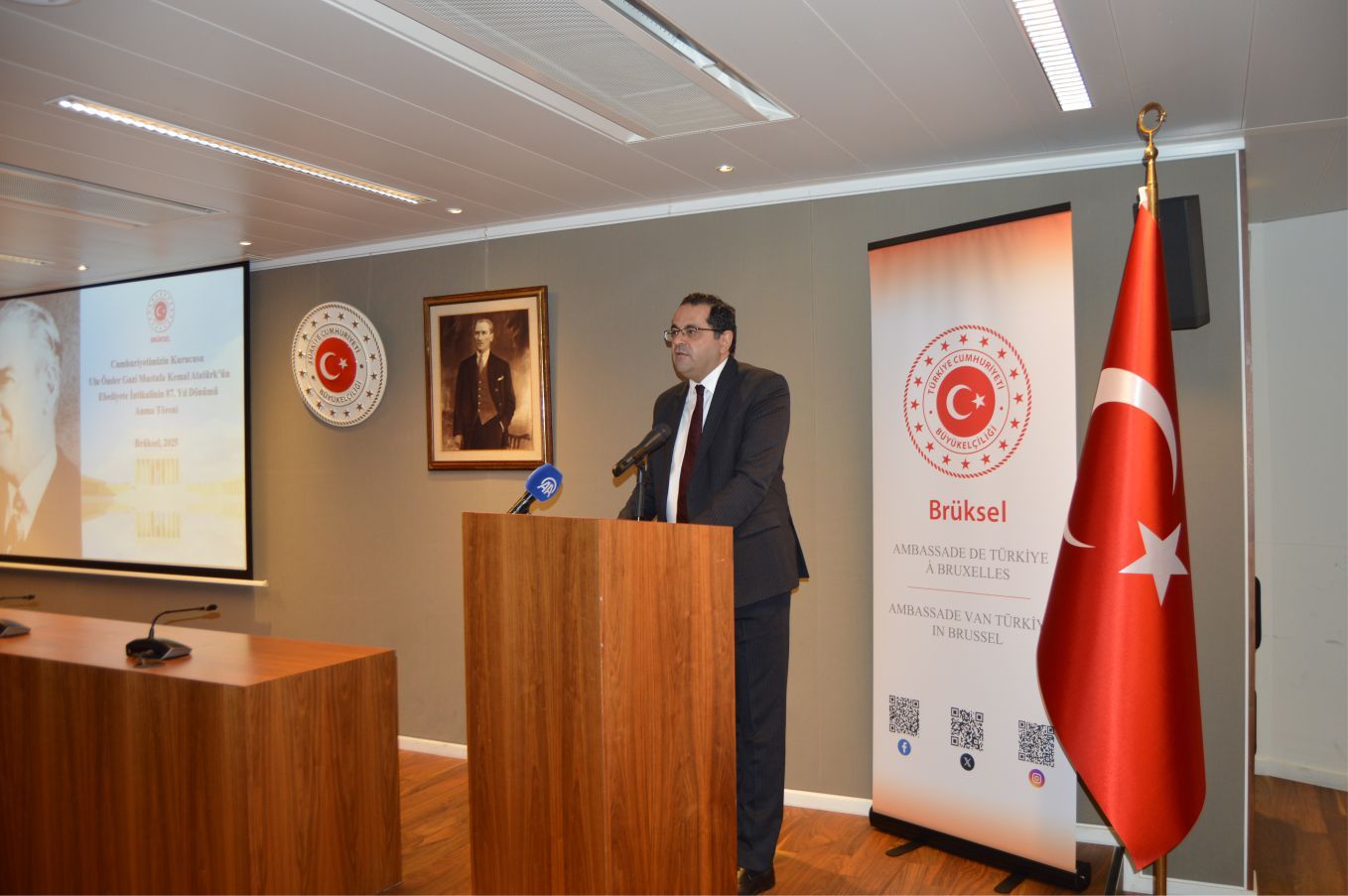 Türkiye'nin Brüksel Büyükelçiliğinde Büyükelçi Barış Tantekin'in ev sahipliğinde yapılan tören, Atatürk ve silah arkadaşlarının anısına saygı duruşu ve İstiklal Marşı'yla başladı.