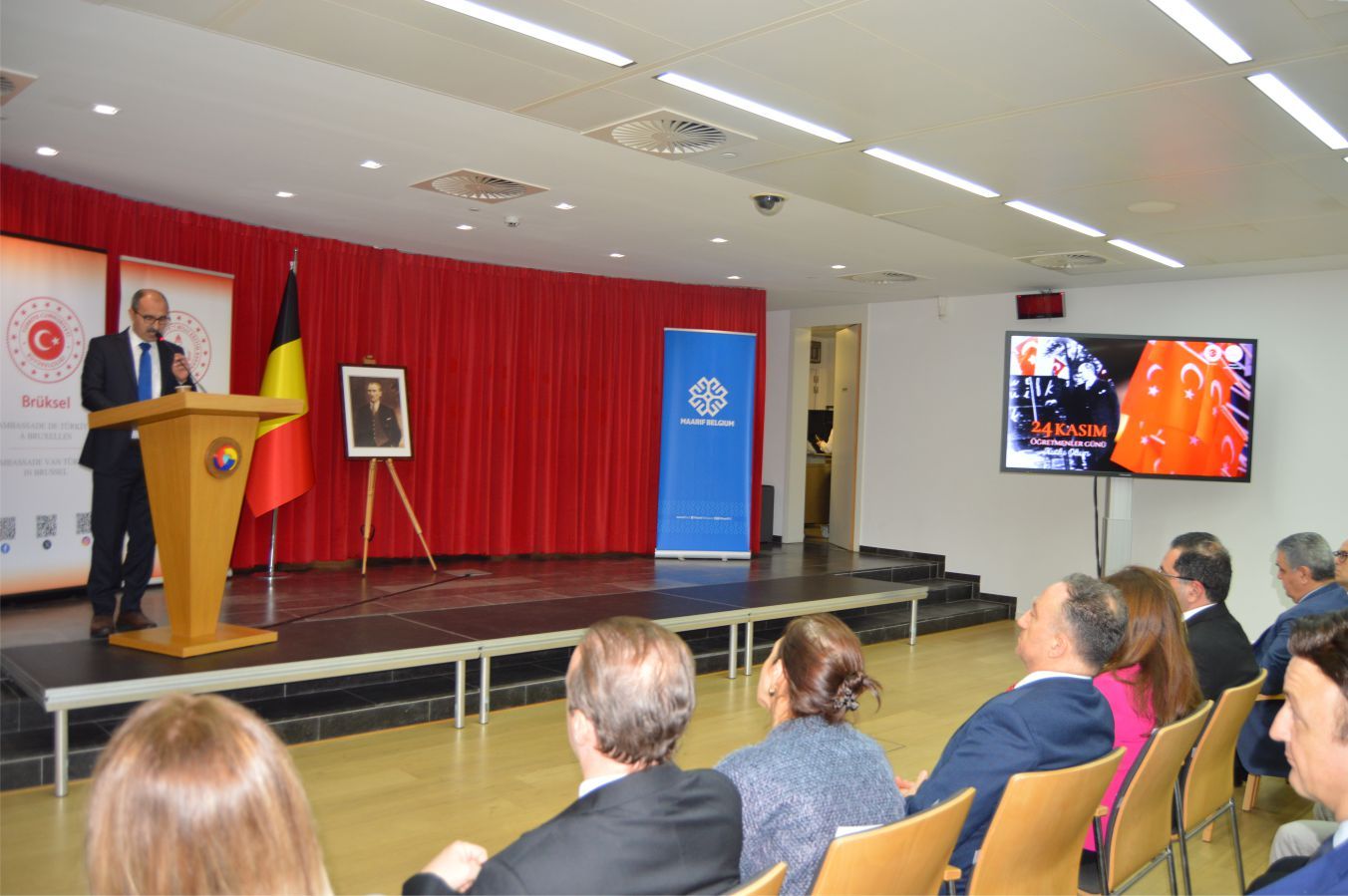 ‘24 Kasım öğretmenler Günü’ güzel ülkemiz Türkiye’de ve yurt dışı temsilciliklerimizde coşkuyla kutlandı. Belçika ve Avrupa’nın Başkenti Brüksel’de de bir kutlama gerçekleştirildi. Brüksel’de bulunan TOBB Salonunda T.C. Brüksel Büyükelçiliği Eğitim Müşavirliği Organizasyonu ve Maarif Vakfı katkılarıyla gerçekleştirilen kutlamada, Eğitim Müşaviri Hümeyra Altıntaş Kıran, Türkçe ve Türk Kültürü Öğretmenleri, davetlileri karşılayarak, tebrikleri kabul ettiler.