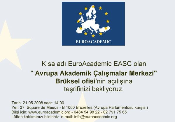 Avrupa Akademik Ãalışmalar Merkezi Brüksel Ofisinden gelen duyuruyu sizlerle paylaşıyoruz. Basın Kuruluşlarımızın değerli temsilcileri, Brüksel Ãniversitesi bünyesinde kurulan ve kısa adı EuroAcademic EASC olan Avrupa Akademik Ãalışmalar Merkezi'nin Brüksel ofisinin açılış kokteylinde sizleri de aramızda görmeyi arzu ediyoruz. Açılışımıza sayın Büyükelçimiz Fuat Tanlay bey ve Belçikalı milletvekili Richard Miller de iştirak edecektir. Pınar Ãamözü Genel Sekreter Lütfen katılımınızı bildiriniz. EuroAcademic EASC Square de Meeus 37 B -1000 Bruxelles www.euroacademic.org info@euroacademic.org 02 791 75 65 0 484 54 98 22