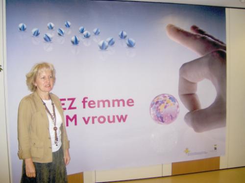 Brüksel Hükümeti EÅit Haklar Bakanı Brigitte Grouwels (CD&V), kabinesinin bulunduÄu binada hazırladıkları anlamlı bir afiÅle kampanyaları ile ilgili basını bilgilendi. EÅitliÄin saÄlanabilmesi için "oylarınız kadınlara" diye baÅlatılan kampanya i