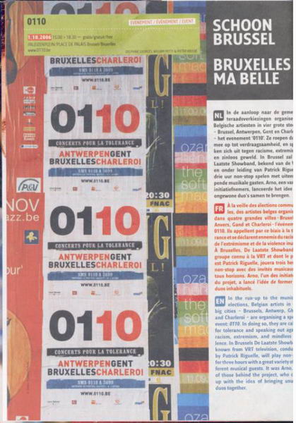 Evere PS meclis Ãyesi adayı Ali İnce'nin bize gönderdiği duyuruyu sizlerle paylaiıyoruz. Belçika genelinde 0110 kod nolu organizasyonlarda Belçika'nın Bruxelles, Antwerpen, Charleroi ve Gent kentlerinde ünlü sanatçıların katılacağı konserlere onbinlerin katılması bekleniyor. Bruxelles'deki konser Place de Palais 1-10-2006 günün 15.00 16.30 arası yapılacaktır. Ali İnce, "Bu konserlere giderek Belçika'da yükselen ırkçılığa karşı sizde dur deyiniz. Bu tür konserlerin insanların ırkçılığa karşı birlik ve dayanışma içinde olması bakımından önemlidir. Türk toplumundanda bu tür konserlere destek verilmesi gerektiğini düşünüyorum. Bu konserlerin ücretsiz olduğunu hatırlatmakta da yarar verdır." dedi.