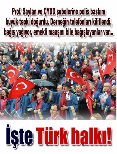 Ergenekon operasyonunun 12. dalgasında genel merkezi ve tüm şubeleri polis tarafından basılan, birçok yöneticisi gözaltına alınan Ãağdaş Yaşamı Destekleme Derneğiâne (ÃYDD) tüm Türkiyeâden destek yağıyor. Yapılan operasyonu âhukuk devleti ilkesiyle bağdaşmayan bir uygulamaâ olarak nitelendiren ÃYDDânin Merkez Yönetim Kurulu üyeleri Gülün Kaya, Lale Platin ve Olcay Yezdani, operasyonun olduğu günden bu yana derneğe yüzlerce destek telefonu geldiğini, vatandaşların arayıp bağışta bulunmak istediklerini anlattı. Destek için arayan kişiler içinde hasta insanların da bulunduğunu belirten dernek yöneticileri, şu örnekleri verdi: âAdapazarıândan Sabahat Kesirli isimli yaşlı bir kadın aradı. âBankada ilerde hastalanırsam diye tuttuğum 10 bin liram var. Ancak, benim hastalığım önemli değil. Bu paranın hepsini size veriyorumâ dedi. Yine, 87 yaşındaki Osman Pakdemir arayarak, âŞu anda çok borcum var ama cebimde 250 TL var, parayı size vereceğim. ÃYDD bu yapılanları hak etmiyorâ dedi. Bilgisayarlara el konulduğunun duyulması üzerine bilgisayar bağışlayanlar var. Sabah bir vatandaş bilgisayarını bırakıp gitmiş, ismini bile bırakmamış. Firmalardan da bilgisayar geliyor.â Bir vatandaşın da arayarak, âBen 67 yaşındayım. Türkan Saylan bu hasta haliyle karşımıza çıkıyorsa, ben de elimden gelen her şeyi yapacağım, yanınızdayızâ diyerek destek verdiğini belirten dernek yöneticileri, şöyle devam etti: âYalovaâdan depremzede yurttaşlar adına arayan bir kişi ise, âTürkan Hoca depremde bizim yanımızdaydı, biz de cuma günü Türkan Saylanâa destek ziyaretine geliyoruzâ dedi. Esin Bayar adlı bir eczacı da, âBu size değil cumhuriyete karşı yapılan bir harekettir. Yarın (bugün) İstanbul Eczacılık Fakültesi önünde protesto eylemi yapacağızâ dedi.â Fazıl Say: Gerekirse 7 gün konser veririm Dünyaca ünlü piyanist Fazıl Say da, Tokyoâdan Türkan Saylanâı arayarak desteğini bildirdi. Sayâın, Saylanâa, âPazar günü dönüyorum. Hemen o gün bir konser organize edelim, dernek yararına çalmak istiyorumâ dediği kaydedildi. Say, ÃYDDâye gönderdiği mektupta da, âDöner dönmez işim gücüm ÃYDD yararına bir dizi konser vermek olacak. Gerekirse günde yedi konser vereceğimâ dedi. Say mektubunda ayrıca AB Kültürlerarası Diyalog Büyükelçisi olarak, ABâye hatırlatmak istediği bir şey olduğunu belirterek, âAKP uyarılmalıdırâ ifadesini kullandı. milliyet.com
