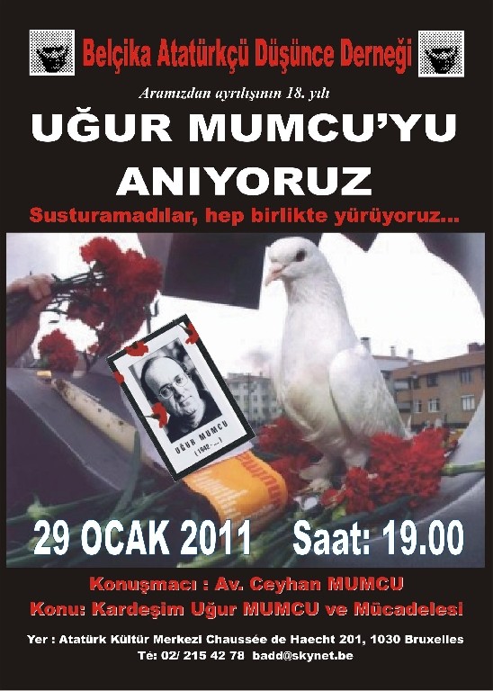 Uğur Mumcu’nun ağabeyisi olan Av. Ceyhan Mumcu’nun “Kardeşim Uğur Mumcu ve Mücadelesi” başlıklı konferansımız 29 Şubat 2011 Cumartesi saat 19,00’da Chaussée de Haecht 201’ 1030’da bulunan Atatürk Kültür merkezinde yapılacaktır.