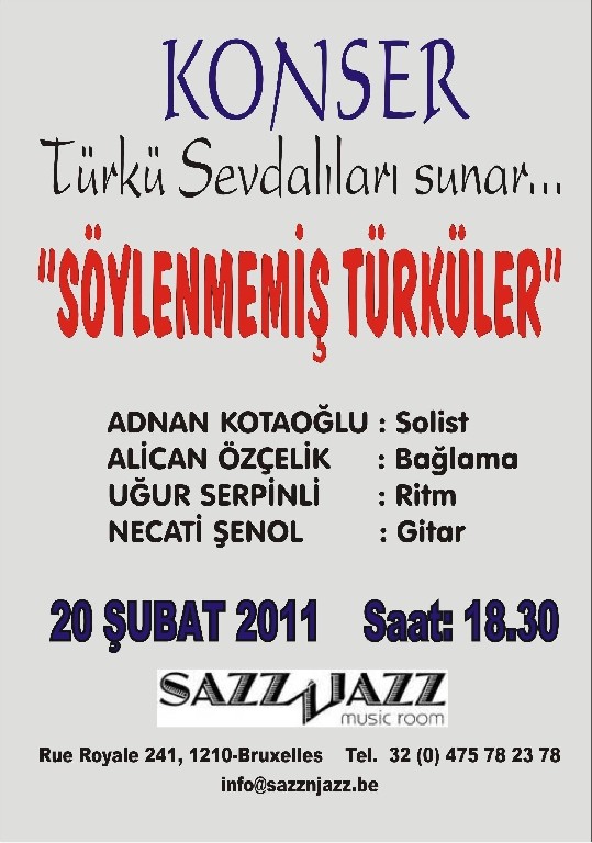 Sanatçı Adnan Kotaoğlu grubuyla beraber Sazz & Jazz´da 20 Şubat 2011, Saat: 18.30´da "Söylenmemiş Türküler´ adlı bir konser sunacaktır.