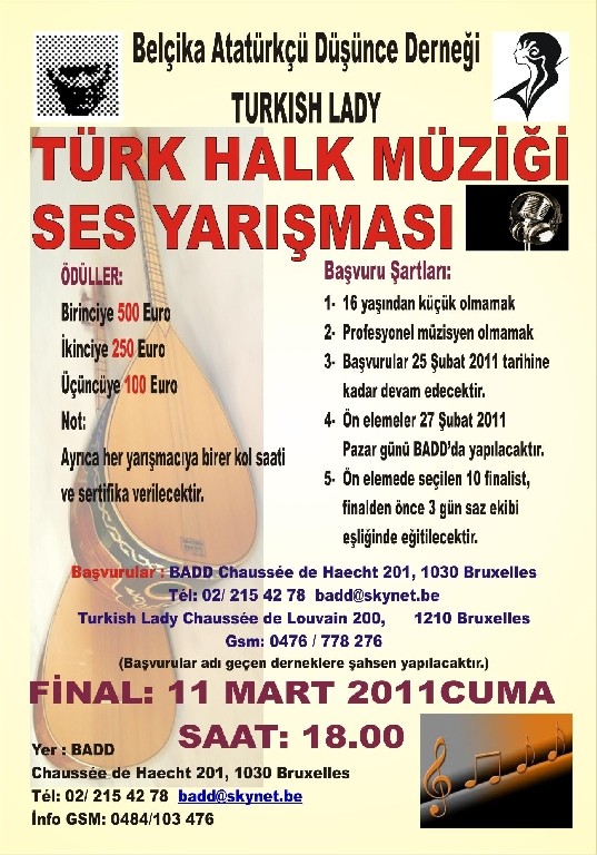 Belçika Atatürkçü Düşünce Derneği ve Turkish Lady'nin ortak organizasyonu ile Türk Halk Müziği yarışması düzenleniyor.