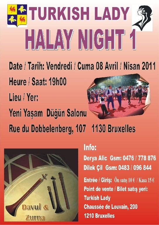 08-04-2011 Cuma günü (bugün) Rue du Dobbelenberg, 107 - 1130 Bruxelles' de bulunan Yaşam Düğün Salonu'nda saat 19.00'da gerçekleşecek olan programda Turkish Lady Gençlerinin birbirinden güzel oyun ve halay gösterileri düzenleyecekleri bildirildi.