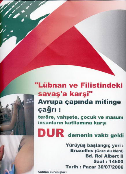 Avrupa genelinde bulunan bazı sivil toplum kuruluÅlarının ortak edecekleri Lübnan ve Filistindeki savaÅ'a karÅı" mittingine onbinlerce insanın katılması bekleniyor. Avrupa çapında gerçekleÅtirilecek miting'de ABD destekcisi İsrail'in Filistin ve Lübnan'da estirdiÄi terör, vahÅet, çocuklar ve masum sivillerin ölümüne artk DUR denilerek protesto edilecek. YürüyüÅüm Bruxelles (Gare du Nord) Bd. Roi Albert II'de bu gün (30 Temmuz) Saat 14.00'de baÅlayacaÄı bildirildi. Katılan kuruluÅlar: AFD EUROPE: Alliance for freedom and d.gnity. Belçika: Amitié belgo-libanaise, Fraternité, Bel agir, v.d.v attawaasol, Horizons, ONG Petits pas, Union des mosqueés d'Anvers, Union des mosqueés de Bruxelles, Union des mosqueés de Liége, Union des mosqueés du Limbourg. Almanya: Toleranz. Interface, Bridge. İngiltere: Britsh for culture and development. İspanya: ONDA a.s.b.l. Fransa: Association P.S.M. Association des cadres musulmans. İtalya: Islamica Delle Alphi Hollanda: Look, Stichting op Koers, Stichting Liefdedadiheid, Vereniging Samen de Toekoms, Marokkaanse Vereniging voor Perticipatie. ABD sestekcisi İsrail'in Filistin ve Lübnan'da iÅlediÄi cinayetlere dur demek için herkesin bu göteriye katılarak, demokratik biçimde tepkilerini yerine getirmeleri gerekir. İnsanlık suçu iÅleyen İsrail'in bu tepkilerle zulmüne dur demek insanlıÄın görevidir.