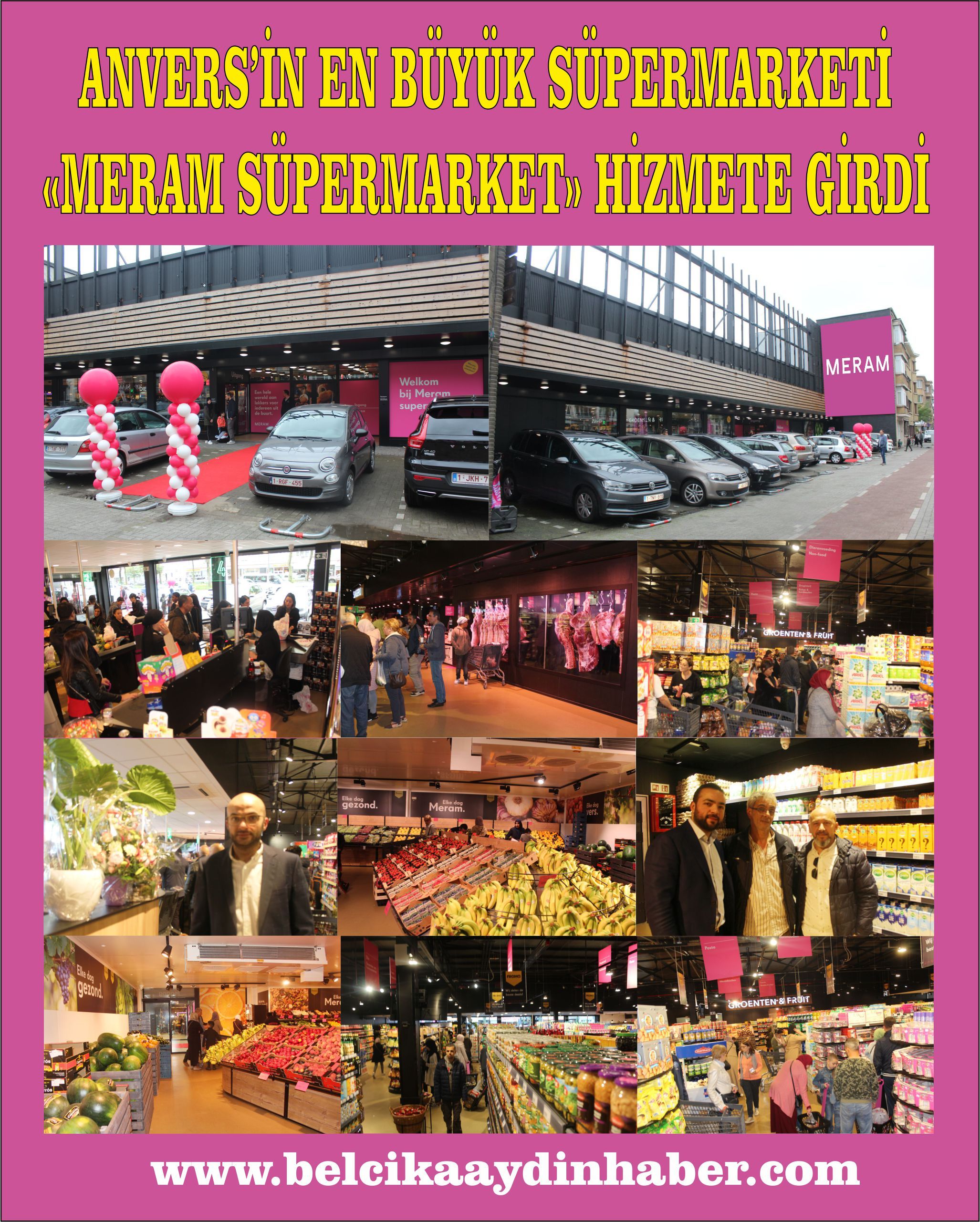 Antwerpen’in merkezi yerinde 1600 metrekarelik bir alan üzerinde kurulan devasa ‘Meram Süpermarket’ te yok yok gibi. Çeşitli yiyecek ve içecek reyonlarının bulunduğu onbinlerce kaliteli ürünün sergilendiği mağazada her şey müşterilerin rahatına göre dizayn edilmiştir. 20 araçlık oto parkı ve geniş alana yerleşmiş reyonlarıyla göz dolduran süpermarketi cazip kılan ise, bol çeşit, kaliteli ürünlerin her ekonomiye uygun bir şekilde pazarlanması dikkat çekti.